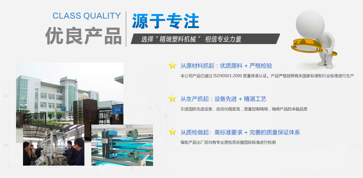 山東精瑞塑料機(jī)械有限公司是集研發(fā)、設(shè)計(jì)和生產(chǎn)管、膜、絲、帶、板、中空和電線電纜等塑料機(jī)械及塑料模具于一體的專業(yè)公司。公司匯集了一批專業(yè)的設(shè)計(jì)人員和研發(fā)人才,熟練的操作工人和經(jīng)驗(yàn)豐富的安裝調(diào)試人員以及專業(yè)化的售后服務(wù)隊(duì)伍,保證了產(chǎn)品的高品質(zhì)、高性能,實(shí)現(xiàn)了快捷高效的售后服務(wù)。公司不斷研發(fā)新產(chǎn)品,產(chǎn)品暢銷全國二十幾個(gè)省、市、自治區(qū),并出口俄羅斯、敘利亞、新加坡、非洲和東南亞等地區(qū),公司擁有自營進(jìn)出口權(quán)。